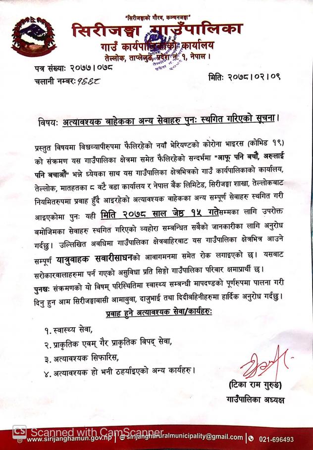 अत्यावश्यक बाहेकका अन्य सेवाहरु पुनःस्थगित गरिएको सूचना।