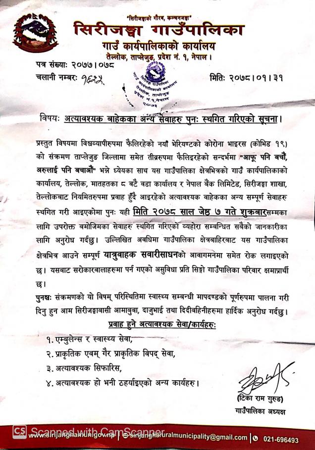 अत्यावश्यक बाहेकका अन्य सेवाहरु पुन: स्थगित गरिएको सूचना ।