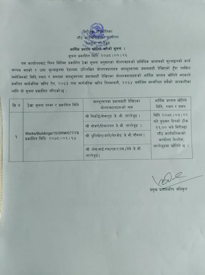 आर्थिक प्रस्ताव खोलिने बारेको सूचना ।
