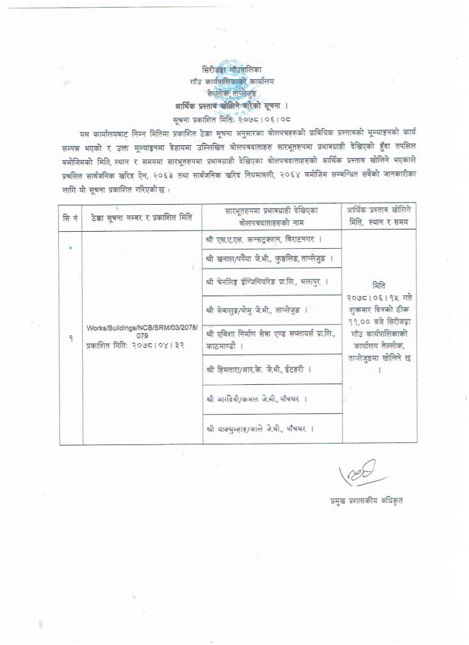 आर्थिक प्रस्ताव खोलिने बारेको सूचना ।