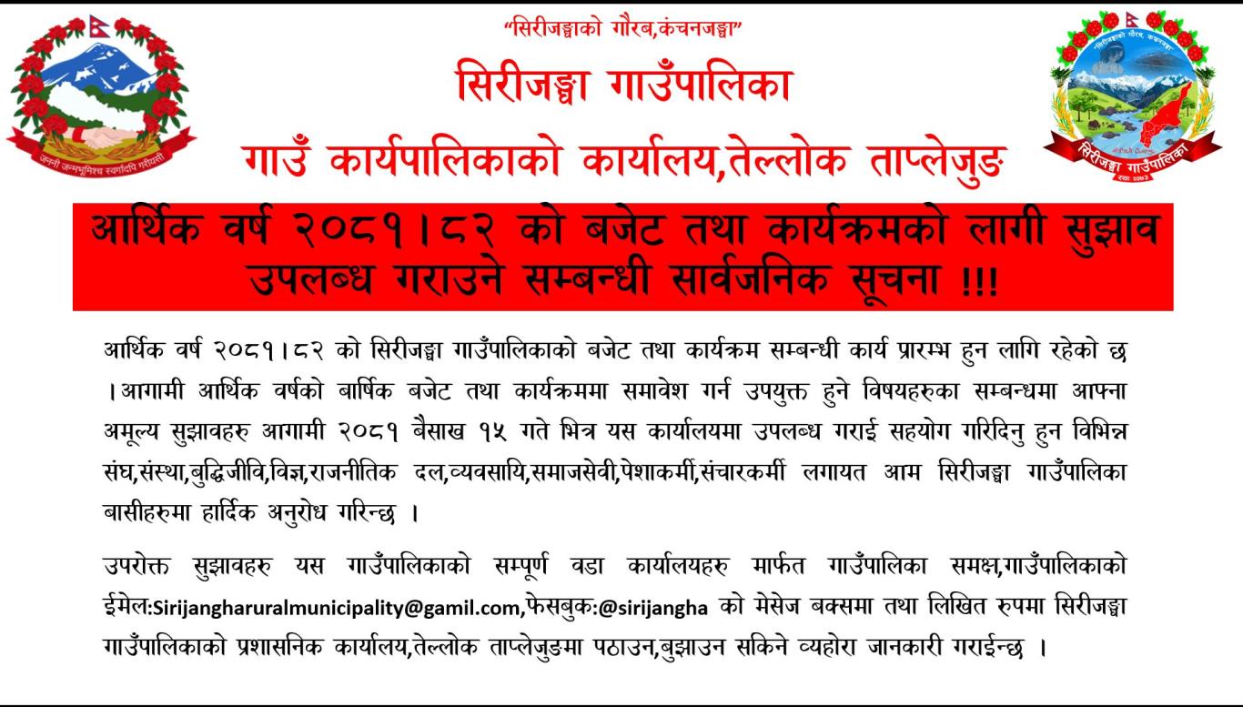 आर्थिक वर्ष २०८१।०८२ को बजेट तथा कार्यक्रमका लागी सुझाव उपलब्ध गराउने सम्बन्धी सार्वजनिक सूचना ।