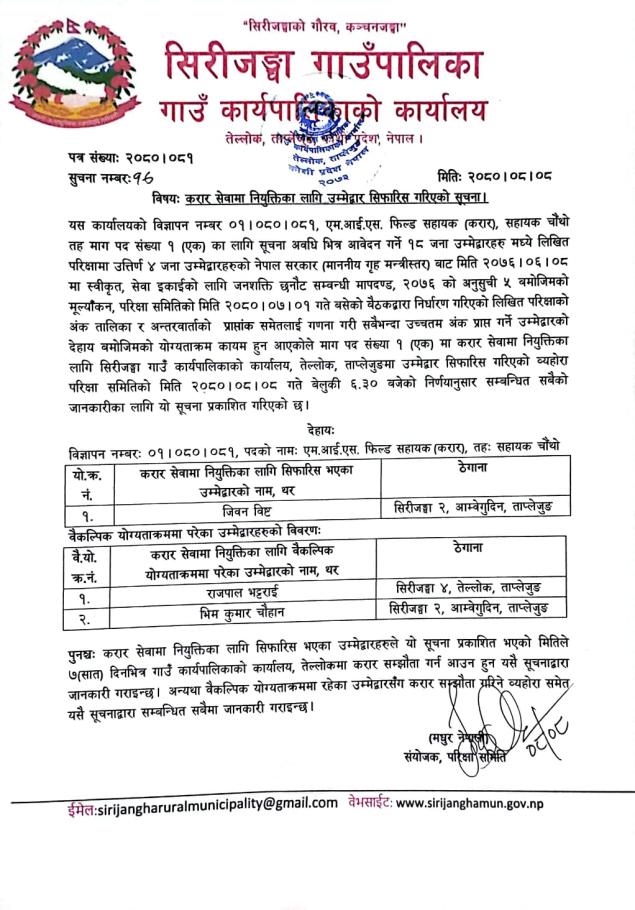एम.आई.एस फिल्ड सहायक र कार्यालय सहयोगि पद करार सेवामा नियुक्तिका लागि उम्मेद्वार सिफारिस गरिएको सूचना ।