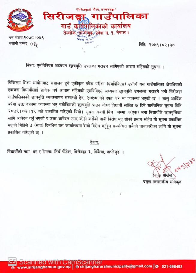 एमबिबिएस अध्ययन छात्रवृत्ति उपलब्ध गराउन लागिएको आशय सहितको सूचना ।