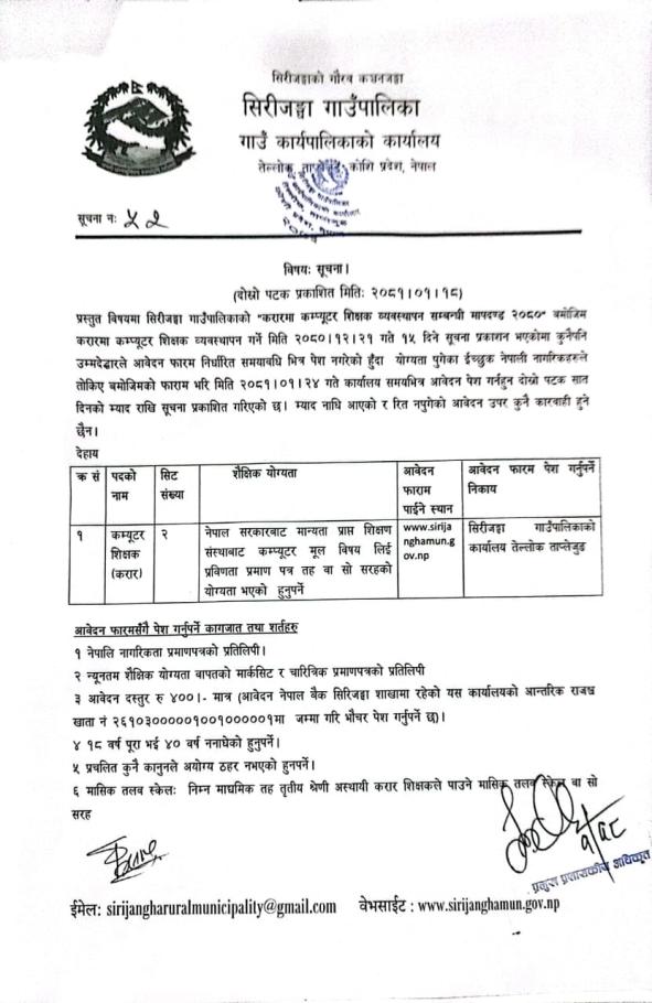 » करार सेवामा कम्प्युटर शिक्षक व्यवस्थापन सम्बन्धी सूचना।