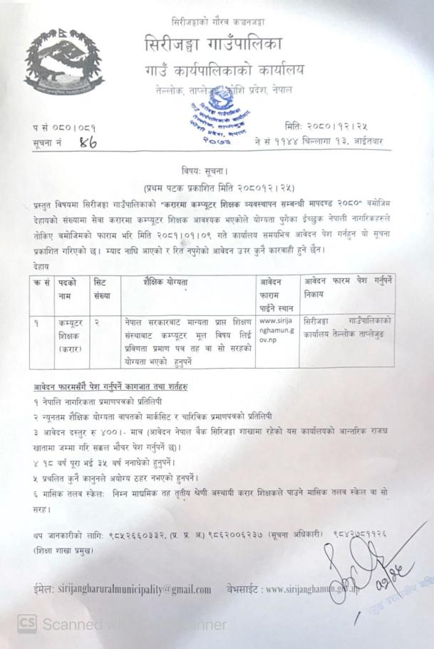करार सेवामा कम्प्यूटर शिक्षक ब्यवस्थापन सम्बन्धि सूचना ।