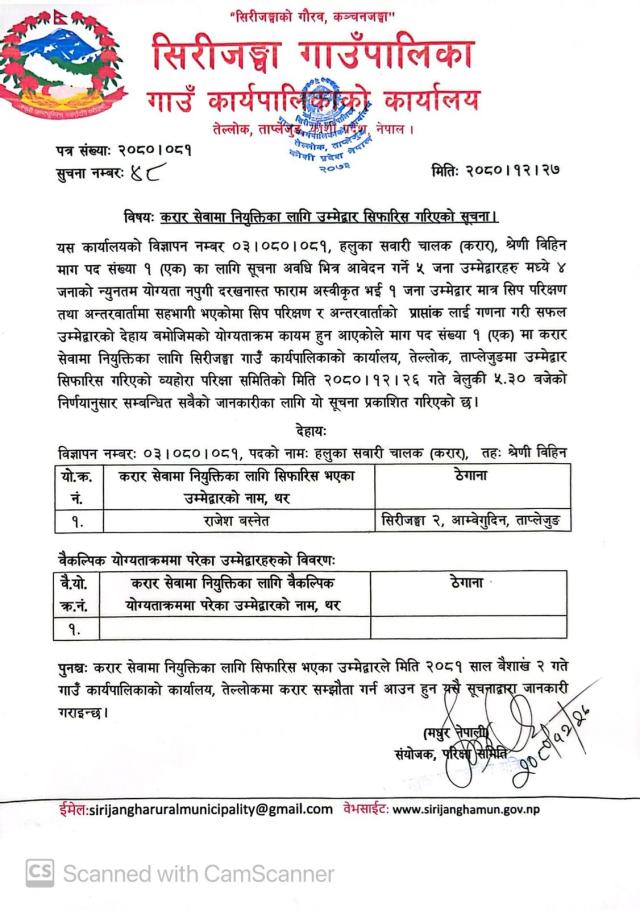 करार सेवामा नियुक्तिका लागि उम्मेद्वार सिफारिस गरिएको सूचना ।