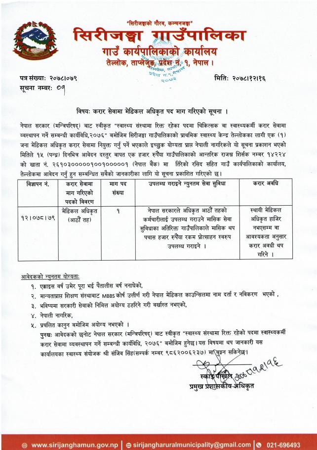 करार सेवामा मेडिकल अधिकृत पद माग गरिएको सूचना ।