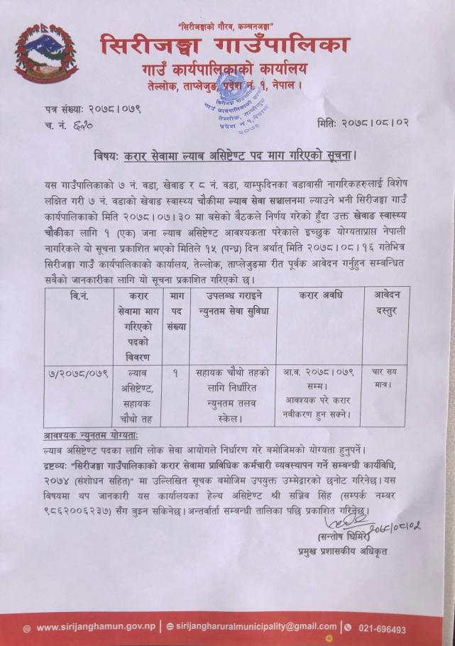 करार सेवामा ल्याब असिष्टेणट पद माग गरिएको सूचना ।