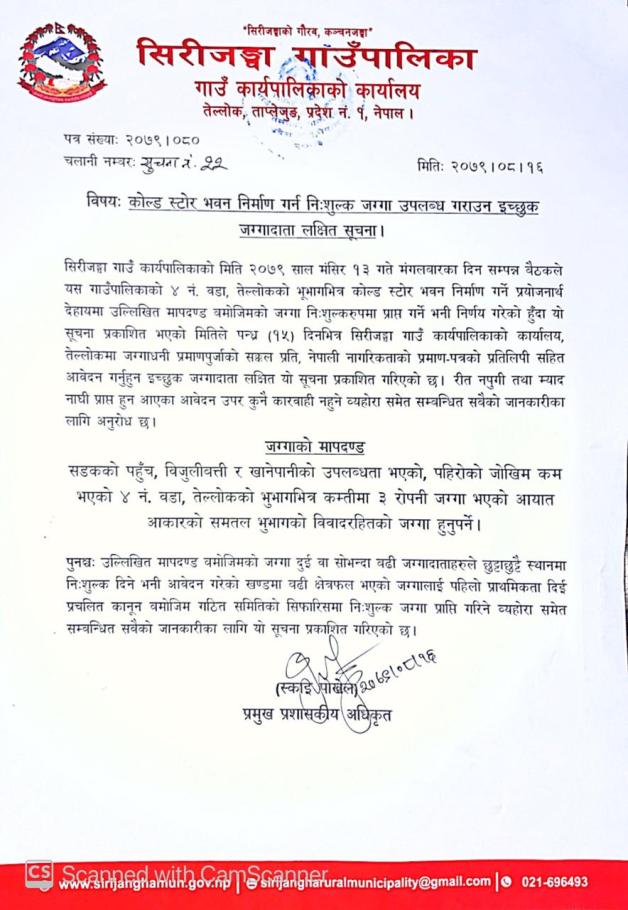 » कोल्ड स्टोर भवन निर्माण गर्न निःशुल्क जग्गा उपलब्ध गराउन इच्छुक जग्गादाता लक्षित सूचना ।