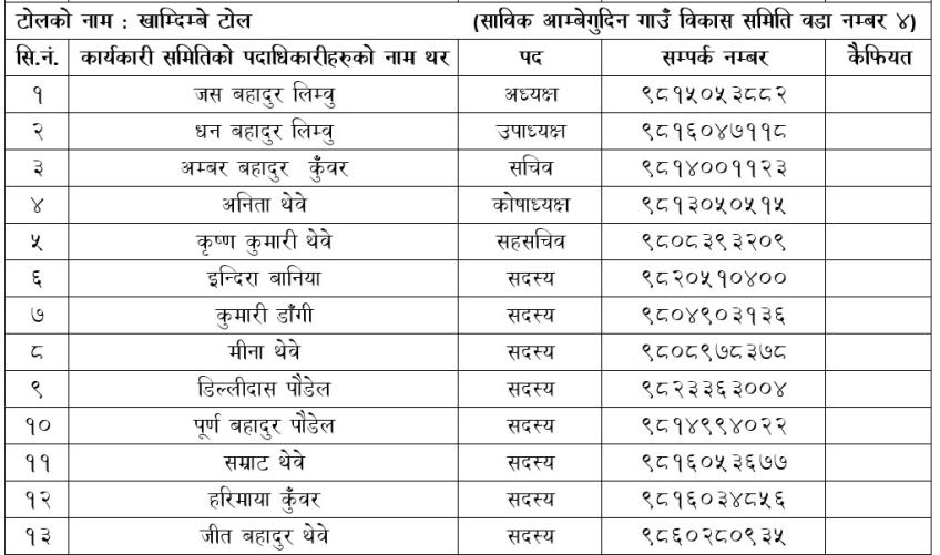 खाम्दिम्बे टोल विकास संस्थाको कार्यकारी समितिमा आवद्ध पदाधिकारीहरुको नामावली तथा सम्पर्क नम्बर देहाय वमोजिम रहेको छ ।