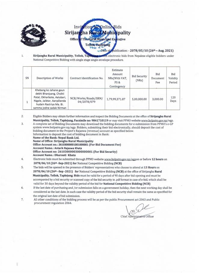 खेवाङको जहाने गाउँदेखि भञ्ज्याङ, चोक्टीपाताल, ओखरबोटे, आलुबारी, निगाले, जैबटार, आपडाडा हुँदै राष्ट्रिय माविसम्म जोड्ने सडक निर्माण आयोजनाको ठेक्का आव्हान गरिएको सूचना ।