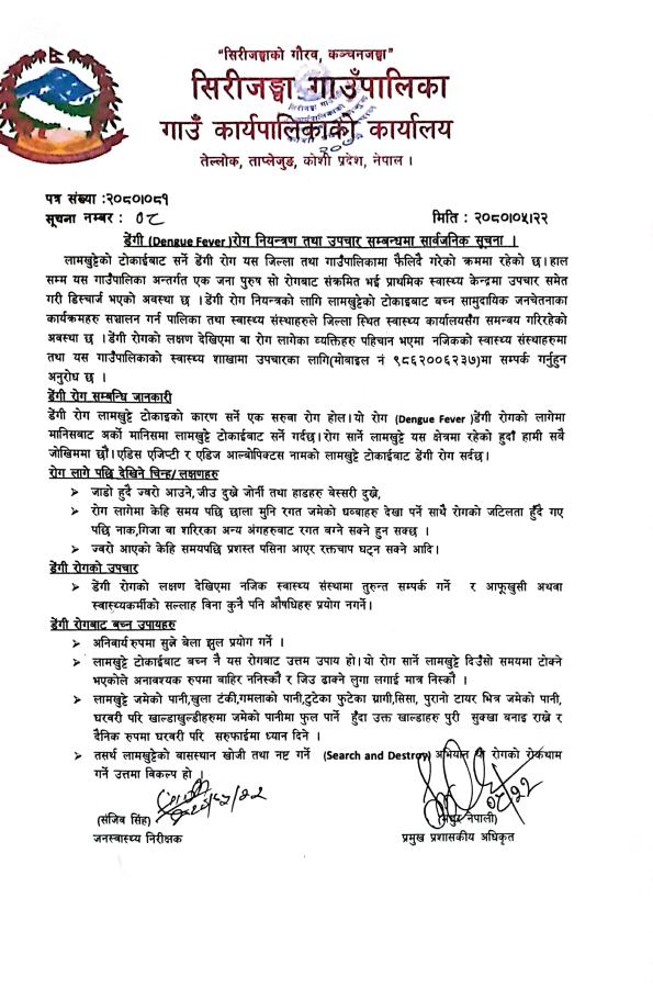 डेंगु रोग नियन्त्रण तथा उपचार समबन्धि सार्वजनिक सूचना ।