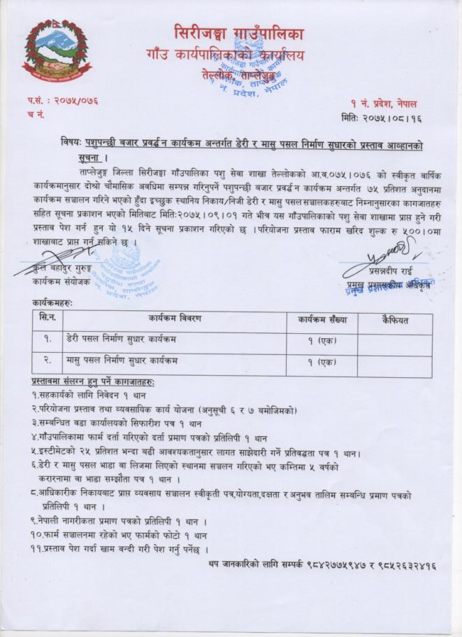 » डेरी र मासु पसल निर्माण सुधारको प्रस्ताव आव्हानको सूचना