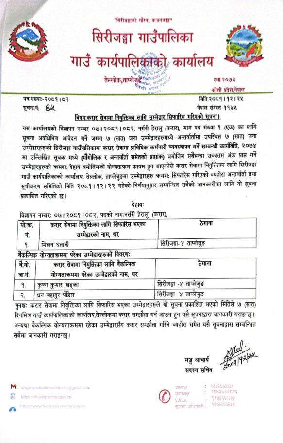 सिरीजङ्घा गाउँपालिका वडा नं. ३ सिकैचा स्वास्थ्य चौकीका लागि सेवा करारमा कार्यालय सहयोगी पदपूर्ति गर्ने सम्बन्धी सूचना ।