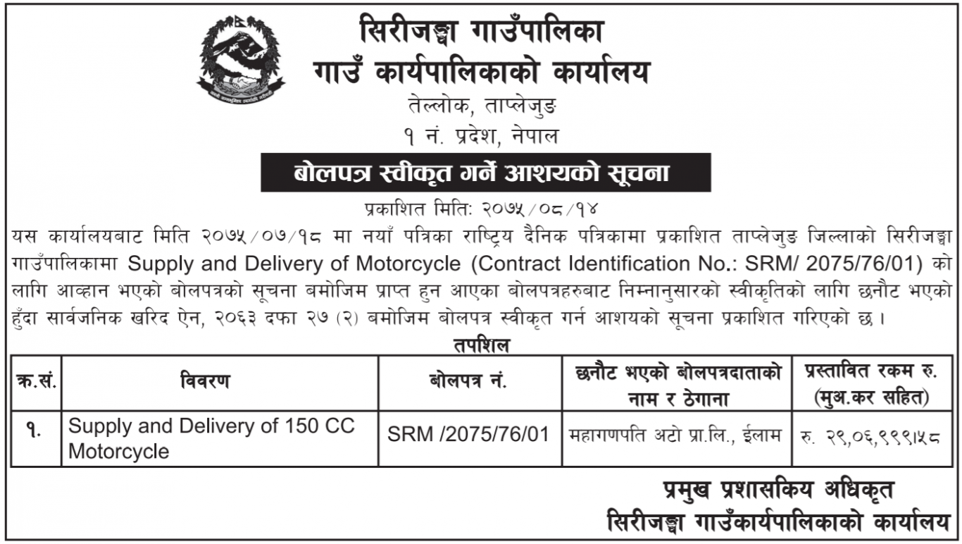 बोलपत्र स्वीकृत गर्ने आशयको सूचना (SRM/2075/76/01 Supply and Delivery of Motorcycle)