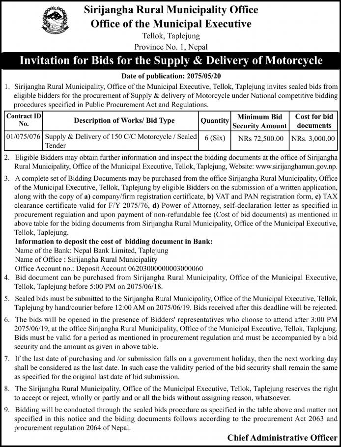 मोटरसाइकल खरिद गर्ने सम्बन्धी सिलबन्दी टेन्डरआव्हानको सुचना!!!