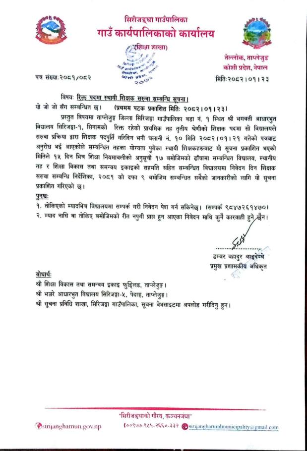 सिरीजङ्घा गाउँपालिका वडा नं. ३ सिकैचा स्वास्थ्य चौकीका लागि सेवा करारमा कार्यालय सहयोगी पदपूर्ति गर्ने सम्बन्धी सूचना ।