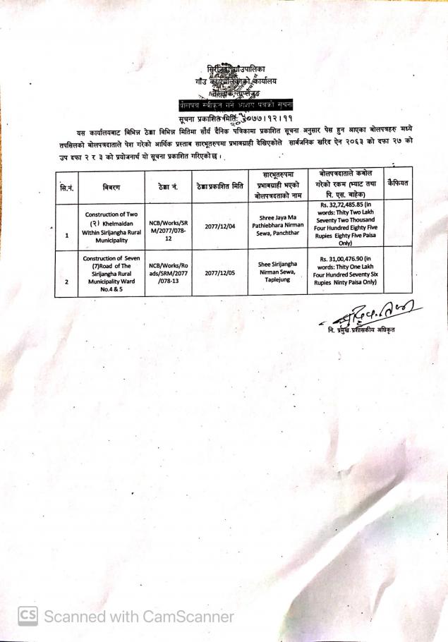 सिरीजङ्घा गाउँपालिका स्थित वडा नम्बर ३ सिकैचाको वडा कार्यालय भवन निर्माण र प्राथमिक स्वास्थ्य केन्द्र तेल्लोकका लागी डिजिटल एक्स-रे मेशिन खरिदका लागि ठेक्का आव्हान गरिएको सूचना