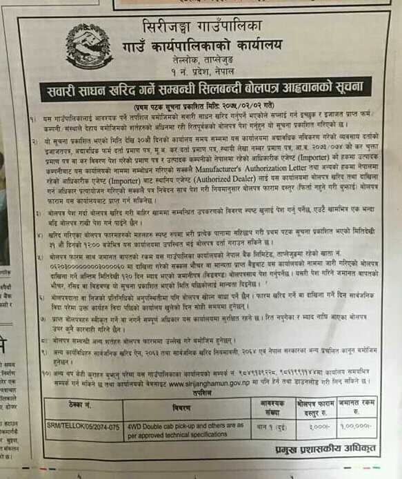 सवारी साधन खरिद गर्ने सम्बन्धी सिलबन्दी बोलपत्र आव्हानको सुचना!!!