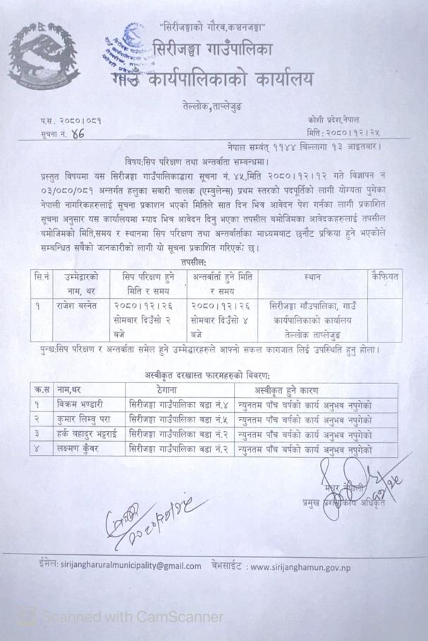 सिरीजङ्घा गाँउपालिकामा हुने प्रयोगितात्मक परीक्षाका लागि दरखास्त फारम