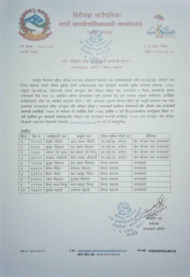 सीप परिक्षण तथा अन्तरवार्ता सम्बन्धी सूचना!!! (एम.आई.एस. अपरेटर र फिल्ड सहायक)