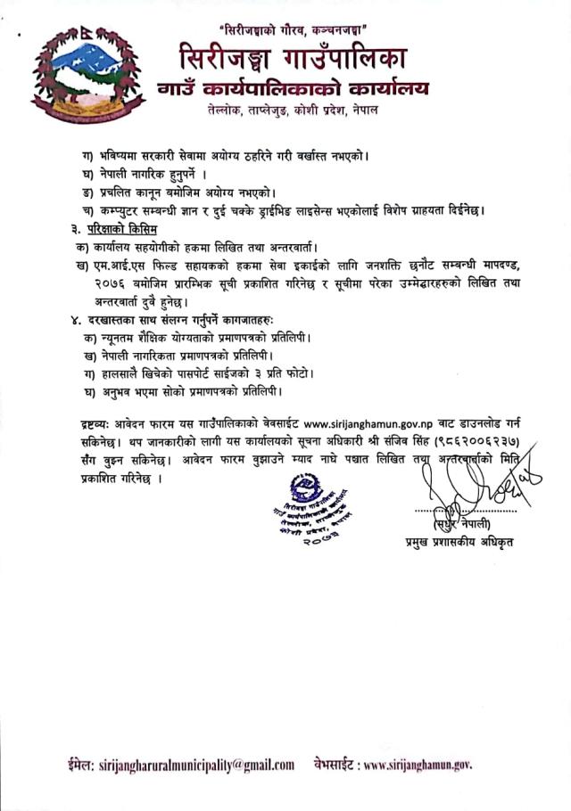 सिरीजङ्घा गाँउपालिकामा हुने प्रयोगितात्मक परीक्षाका लागि दरखास्त फारम