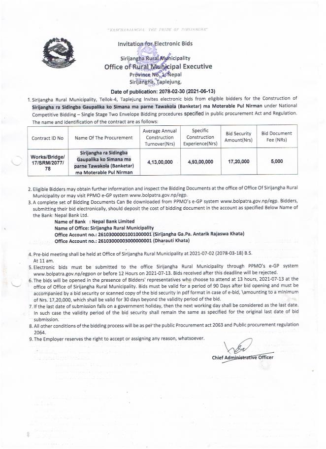 ढुंगा, गिट्टी, रोडा तथा वालुवा निकासी शुल्क संकलन कार्यको लागि सिलबन्दी बोलपत्र आव्हान सम्बन्धी सूचना ।