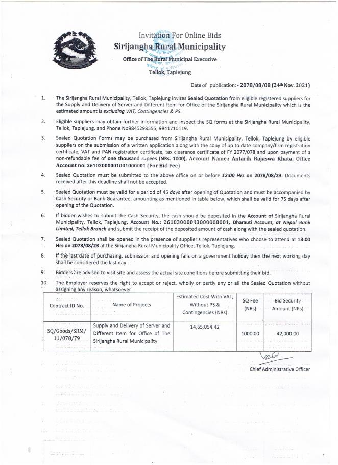 सिरीजङ्घा गाउँपालिका स्थित वडा नम्बर ३ सिकैचाको वडा कार्यालय भवन निर्माण र प्राथमिक स्वास्थ्य केन्द्र तेल्लोकका लागी डिजिटल एक्स-रे मेशिन खरिदका लागि ठेक्का आव्हान गरिएको सूचना