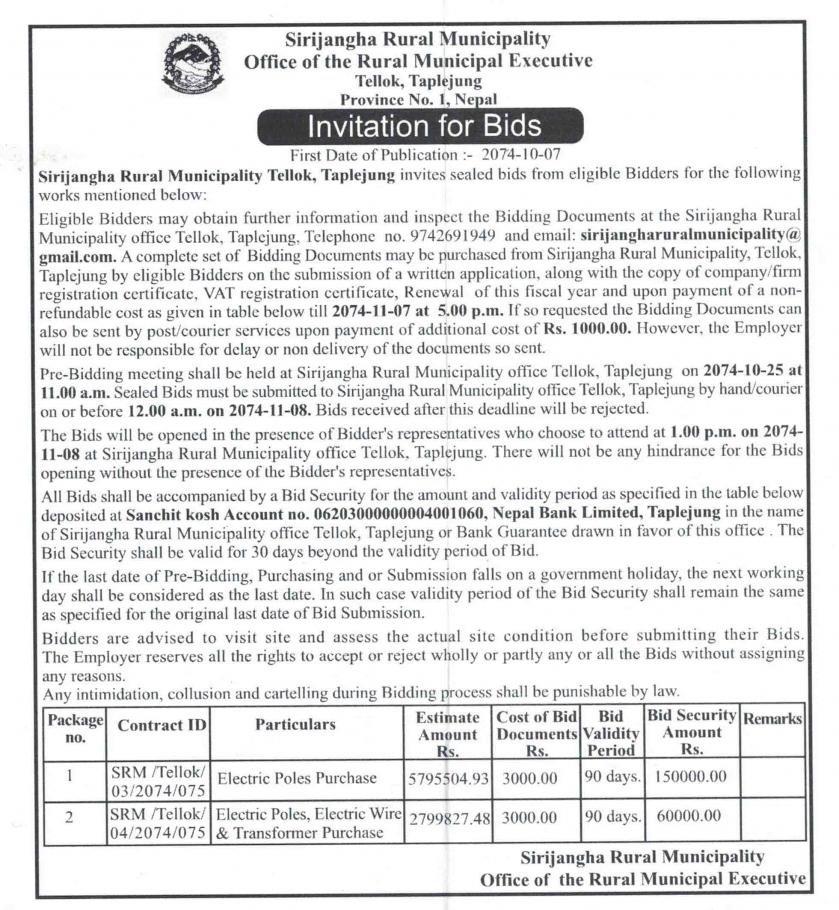 Interested and eligible bidders can also see detailed information on Nagarik National daily, Sunday, 07-10-2074.