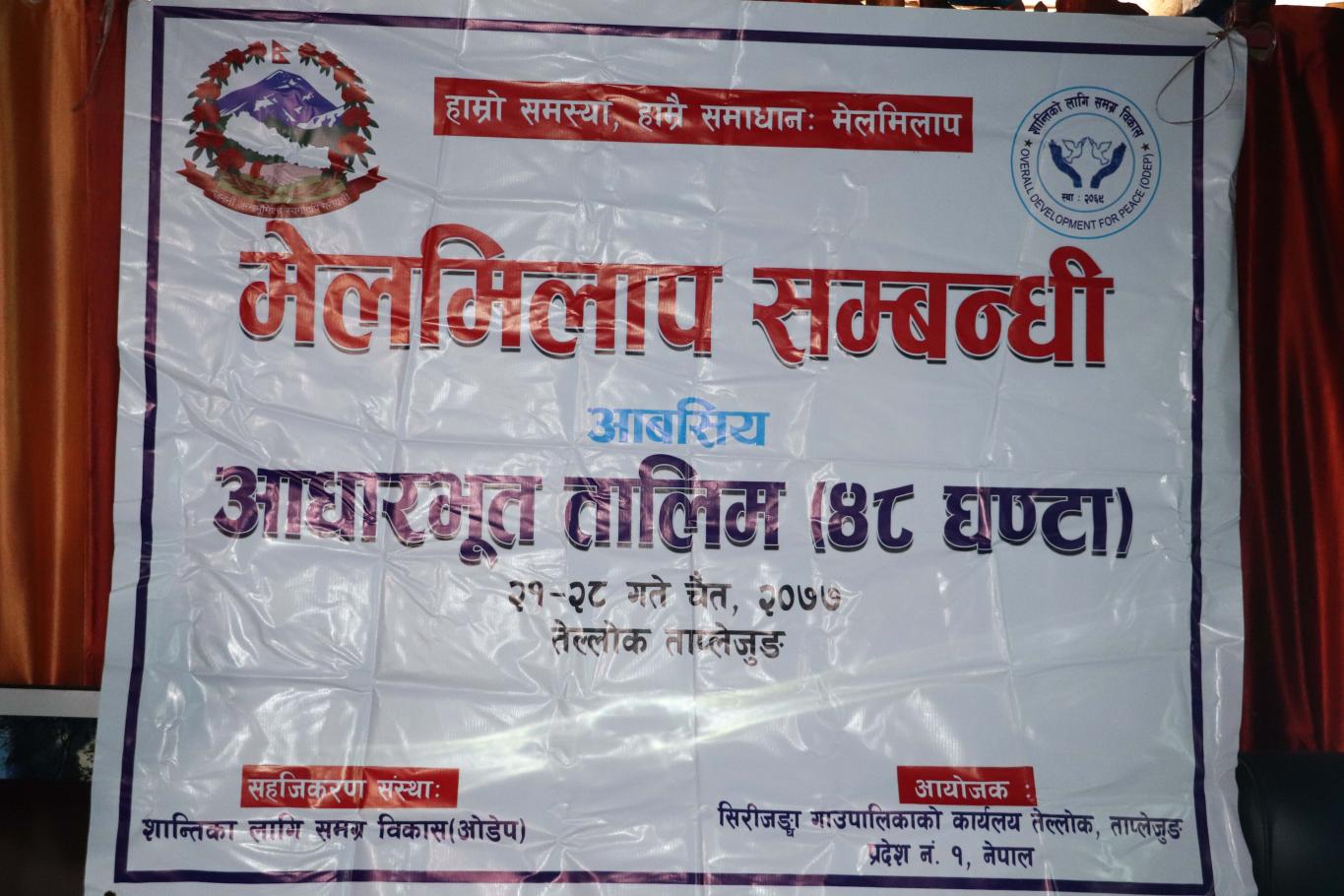 मेलमिलाप सम्बन्धी आधारभूत आवासीय तालिमका तस्वीरहरू। उक्त तालिम कार्यक्रमको समापन समारोहमा ताप्लेजुङ जिल्ला अदालतका माननीय जिल्ला न्यायाधीश श्री प्रकाश राउत ज्यू प्रमुख अतिथिको रुपमा उपस्थित हुनु भएको थियो