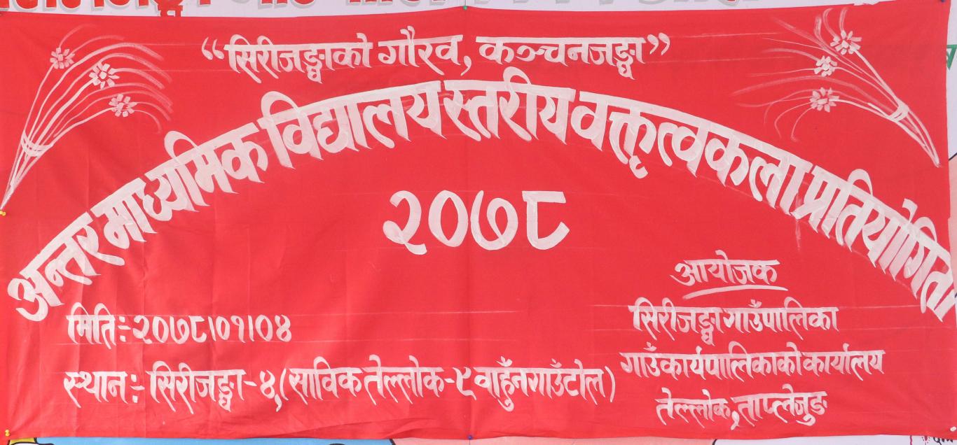 नयाँ वर्ष २०७८ सालको उपलक्ष्यमा सिरीजङ्घा गाउँपालिकाद्वारा आयोजित "ताप्लेजुङ जिल्लाभित्रका अन्तर माध्यमिक विद्यालय स्तरीय वक्तृत्वकला प्रतियोगिता, २०७८" सम्पन्न भएको छ। प्रतियोगितामा ताप्लेजुङ जिल्लाका ८ वटा स्थानीय तहभित्रका विभिन्न २७ वटा सामुदायिक विद्यालयका विद्यार्थीहरुको सहभागिता रहेको थियो। पहिलो चरणबाट उत्कृष्ट ५ विद्यार्थी छनोट गर्ने गरि समग्र प्रतियोगितालाई दुई चरणमा विभक्त गरिएको थियो। जस अनुसार पहिलो चरणबाट जम्मा ५ जना विद्यार्थीहरु प्रतियोगिताको दोस्रो एवम् फाइनल चरणमा प्रवेश गरेका थिए भने फाइनल चरणबाट देहायमा उल्लिखित विद्यार्थीहरुले क्रमशः प्रथम, द्वितीय, तृतीय र सान्त्वनाको