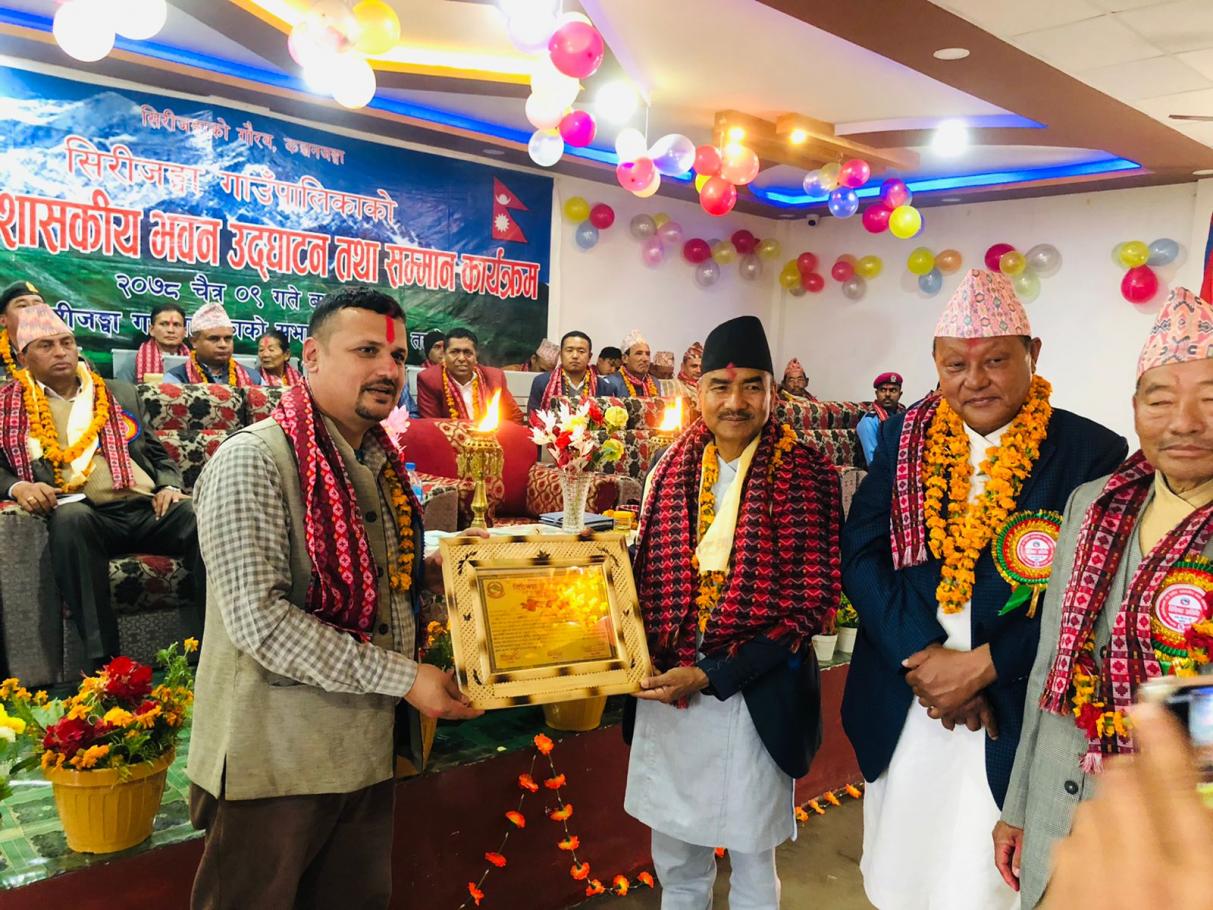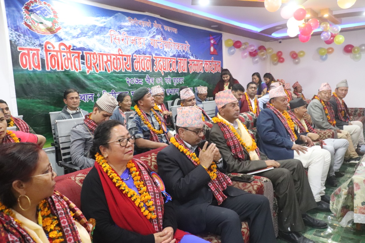 नेपाल सरकारका खानेपानी मन्त्री माननीय उमाकान्त चौधरी ज्यूले आज मिति २०७८ साल चैत्र ०९ गते बुधबारका दिन सिरीजङ्घा गाउँपालिकाको नवनिर्मित प्रशासकीय भवनको उद्घाटन गर्नु भएको छ। सिरीजङ्घा गाउँपालिकाका अध्यक्ष श्री टिका राम गुरुङज्यूको अध्यक्षतामा सम्पन्न भएको उक्त कार्यक्रममा नेपाल सरकारका पूर्व स्वास्थ्य राज्यमन्त्री माननीय तारामान गुरुङ र संविधान सभा सदस्य माननीय भूपेन्द्र थेबे ज्यू विशिष्ट अतिथिको रुपमा उपस्थित हुनु भएको थियो। प्रमुख जिल्ला अधिकारी, विभिन्न राजनैतिक दल, जनप्रतिनिधि, टोल विकास संस्था, विभिन्न कार्यालयका प्रमुख एवम् प्रतिनिधि एवम् स्थानीयबासी समेतको उपस्थितिमा सम्पन्न उक्त कार